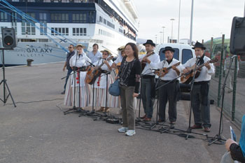 A las 09.00 horas los pasajeros, en su mayoría ingleses, que bajaban a tierra para dirigirse a las guaguas se encontraban con una agradable sorpresa, seis componentes de la Agrupación Charco de San Ginés les daban la bienvenida mientras varias señoritas repartían información de los Centros Turísticos a través de un stand del Patronato de Turismo.