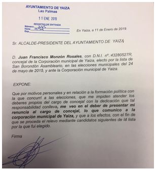 Mediante un comunicado de prensa, el propio Monzón traslada a la opinión pública en general y a los vecinos de Yaiza en particular su "decisión de abandonar y solicitar mi baja de militancia en San Borondón Asambleario, formación por la que concurrí a las elecciones municipales de 2015 consiguiendo un acta de concejal, al que hoy he renunciado formalmente".