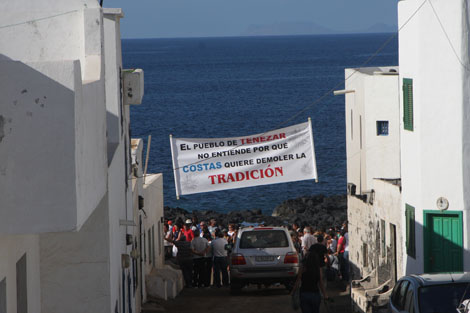 "Ir contra los más humildes ¡no es la solución!". Bajo este lema y con una enorme pancarta dando algo de sombra en una tarde de bochorno se reunieron decenas de vecinos del pueblo de Tenezar, en Tinajo, para protestar contra lo que consideran que está siendo un abuso por parte de la Dirección General de Costas.