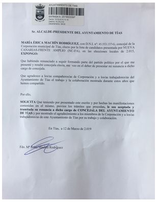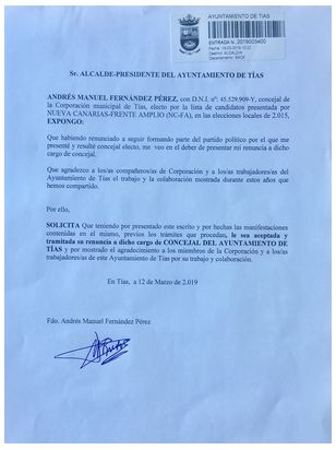 Resta ahora que Ramón Ortiz formalice también su renuncia como concejal de NC en Tinajo, tal y como también anunció.