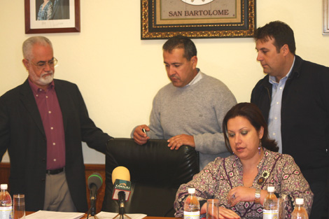 El alcalde de San Bartolomé, Marcial Martín, negó que el grupo de gobierno que preside haya orquestado una persecución a miembros del Comité de Empresa del Ayuntamiento tal y como lo denunciaron públicamente este martes cuatro organizaciones sindicales. Martín dijo que se trata de una “táctica sindical” y reiteró la “falsedad” de dicha acusación. El máximo responsable de la Corporación, acompañado de los concejales del grupo de gobierno, sostuvo en rueda de prensa que la estabilidad presupuestaria del municipio permanece en riesgo si no actúa con responsabilidad y sigue adoptando medidas de reducción del gasto. Citando el informe de Intervención, Martín, a propósito de los 18 despidos, destacó que para la Administración es inasumible la masa salarial, que en 2009 será de 7 millones de euros, si se tiene en cuenta la disminución de ingresos por el orden de 2,5 a 3 millones de euros. Martín no descartó nuevos despidos y dejó entrever que dependerá de si empeoran o no las cuentas municipales. El alcalde achacó íntegramente la culpa al grupo de gobierno anterior recordando que encontró la Administración con una deuda superior a los 24 millones de euros. Varios de los ediles de la oposición siguieron atentamente la comparecencia de Marcial Martín, quien echa en falta una reacción sindical si quiera parecida por los más de 5.000 empleos que se han perdido en Lanzarote durante los últimos meses.