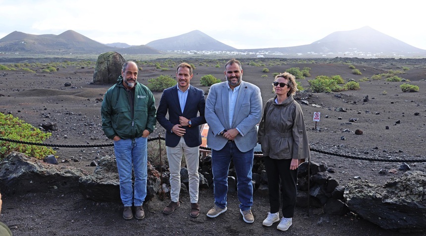 El consejero de Transición Ecológica y Energía del Gobierno de Canarias, Mariano H. Zapata, y el consejero de Medio Ambiente del Cabildo de Lanzarote, Samuel Martín, han visitado las obras de restauración de los conos volcánicos del Parque Natural de Los Volcanes para comprobar in situ el avance de los trabajos. El proyecto, según la información aportada en nota de prensa, cuenta con un presupuesto de 968.727 euros de fondos Next Generation.