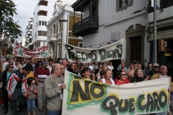 En esta segunda manifestación, organizada por Leticia Padilla y su esposo, Fernando Marcet, mucho más numerosa que la primera, se comenzó frente al Cabildo Viejo con pancartas que rezaban “Precios dignos”, “Ño, qué caro”, “Libre mercado”, “No al monopolio” y gritos al unísono de “Si no te quejas te suben las lentejas”, “Hiperdino, Hipertimo” o “Manos arriba, esto es un atraco”, mientras ponían las manos en alto en señal de protesta.