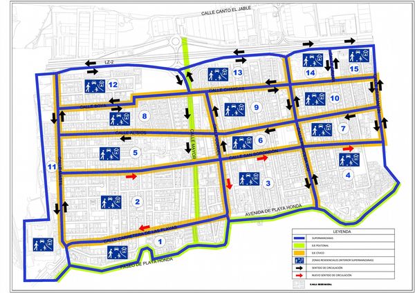 - Propone crear supermanzanas con señalización, pavimento único y ampliación de aceras, así como dar continuidad al eje peatonal de la calle Mayor para configurar un paseo desde la LZ-2 hasta el mar y establecer una red ciclista segregada para los itinerarios principales. La optimización de los aparcamientos y el establecimiento de puntos de recarga eléctrica, la mejora y remodelación del transporte público y la creación de un potente centro intermodal de transporte, o la mejora de los accesos al aeropuerto, son otras de las líneas planteadas en este Plan