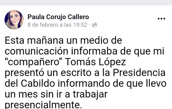"Esta mañana un medio de comunicación informaba de que mi “compañero” Tomás López presentó un escrito a la Presidencia del Cabildo informando de que llevo un mes sin ir a trabajar presencialmente.