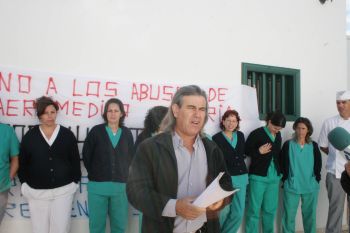 Primer día de huelga indefinida de la plantilla de la Residenciade mayores San Roque de Tinajo, institución propiedad del Cabildo y gestionada desde enero de 2005 por la siempre polémica Aeromédica Canarias S. L. Una huelga que se antoja muy larga dados los precedentes en las negociaciones con la mencionada empresa, según dijo en declaraciones a este diario el secretario de Acción Sindical de Comisiones Obreras, Ramón Pérez Farray, que desde el comienzo del largo conflicto laboral entre Aeromédica y los trabajadores siempre ha tomado parte activa en todas las movilizaciones sindicales. Como hizo en la mañana de este lunes, entre las diez y diez y media de la mañana, tiempo que aprovecharon los trabajadores para concentrarse a las puertas de la residencia.