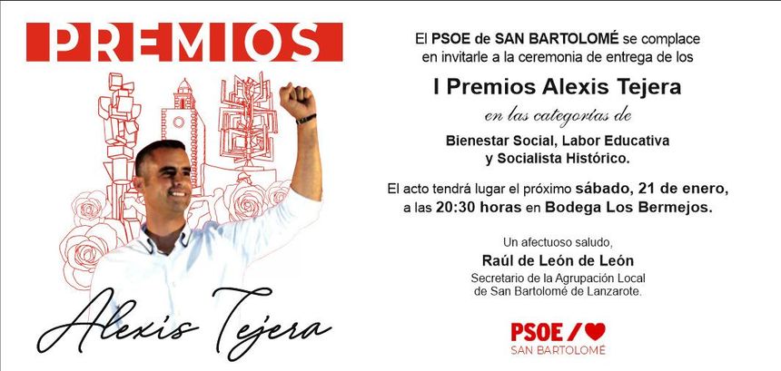 El Partido Socialista (PSOE) de San Bartolomé celebrará la II edición de los Premios Alexis Tejera, que reconocerá la labor y aportación social de personas y entidades insulares. El acto de entrega de la distinción que otorga la Agrupación Socialista de San Bartolomé se celebrará el próximo viernes, 12 de abril, a partir de las 20:30 horas en la Bodega Los Bermejos.