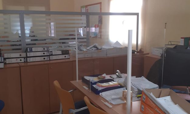 El Ayuntamiento de San Bartolomé prepara las instalaciones municipales para la reapertura de las oficinas dotándolas con mamparas de metacrilato como medida de protección y prevención.