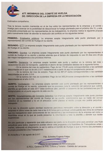 "No obstante lo anterior y sin tener derecho a ello, para evitar la huelga la empresa accedió a pagarles los 13 meses con carácter retroactivo (casi 300.00 €) y ya se les ofreció el plan de pagos que ahora reclaman, pero también la rechazaron pidiendo adicionalmente, para evitar el acuerdo, en torno a un millón de euros más, lo cual supondría una subida salarial ilegal y debe ser por eso que niegan haberla reclamado y no la han formulado por escrito. Es más, ayer sábado efectivamente exigieron su abono por anticipado como condición para suspender la huelga, a sabiendas de que no podemos acceder a eso", advierte el presidente.