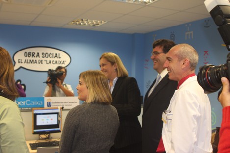 La consejera de Sanidad, Mercedes Roldós, acompañada del director ejecutivo territorial de La Caixa, Andrés Orozco, inauguró este lunes la ciberaula del Hospital Doctor José Molina Orosa de Lanzarote, un espacio de ocio y comunicación para los pequeños ingresados y sus familias, que forma parte del convenio entre el Gobierno canario y la Fundación La Caixa. La iniciativa tiene por objetivo impulsar las comunicaciones por ordenador en las actividades educativas que se desarrollan en las aulas hospitalarias para fomentar el desarrollo educativo de los menores enfermos.