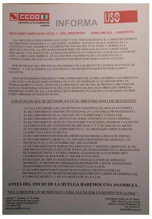 Los sindicatos de los trabajadores del Aeropuerto de Lanzarote han denunciado este lunes "intimidaciones" por la huelga indefinida que ha arrancado en esta jornada de 22 de agosto. Los sindicatos critican que la empresa Swissport Handling “ha amenazado a los trabajadores con despidos y otras represalias laborales si secundan la huelga” y creen que su única intención, "con la connivencia" del Ministerio de Fomento, es "putear" a los trabajadores.