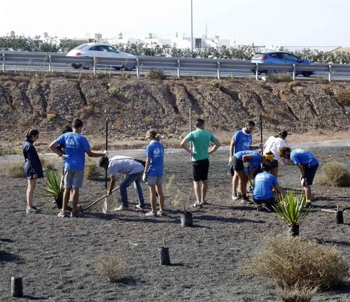 Los jóvenes universitarios del programa de voluntariado de la Universidad de Las Palmas de Gran Canaria 'Ruta 7', coordinados en algunas actuaciones por el Cabildo de Lanzarote, a través de la Reserva de la Biosfera, y el Ayuntamiento de Arrecife, han limpiado y adecentado este viernes por la mañana un solar del barrio de Argana Alta, en Arrecife, que se encontraba bastante degradado.