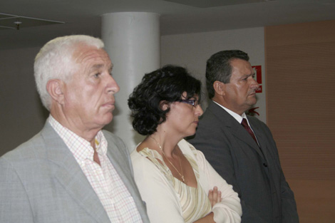 Juan Ramírez Montero -al fondo- y los otros dos acusados, la ex secretaria del Ayuntamiento, Teresa Caba, y el arrendador de la finca, Rafael Pedro Perdomo Reyes.
