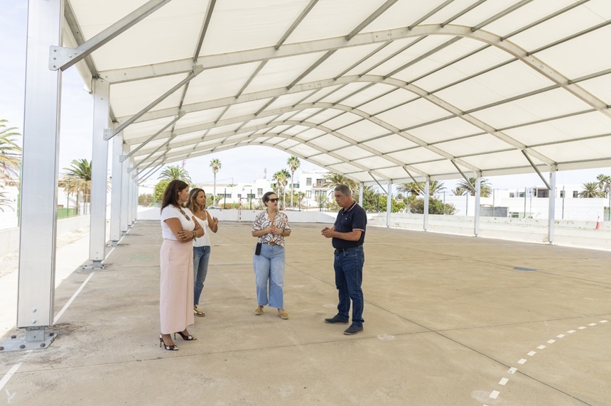El Ayuntamiento de Teguise, a través de las áreas de Educación y Vías y Obras, está llevando a cabo la instalación de una cubierta en el CEIP Doctor Alfonso Spínola, en La Villa, con el objetivo de ofrecer mayor confort y protección frente al sol al alumnado y al personal docente del centro.