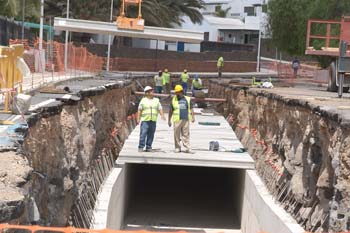 Con anterioridad a Puerto del Carmen, el consejero visitó las obras de ampliación de la red de saneamiento que en estos momentos tiene en ejecución su departamento en la capital de la Isla. La inversión aquí alcanza 13,4 millones de euros y dotará a la ciudad de un sistema operativo de colectores de las aguas de lluvia. Hay que señalar que se estudia el traslado de la antigua estación de bombeo de la calle Portugal.