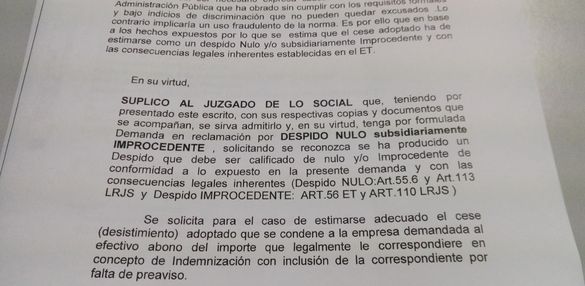En un último párrafo un tanto confuso, tras pedir al tribunal la admisión a trámite de la demanda de reclamación de despido nulo y/o improcedente, solicita que "para el caso de estimarse adecuado el cese (desestimiento) adoptado que se condene a la empresa demandada al efectivo abono del importe que legalmente le correspondiere en concepto de indemnización con inclusión de la correspondiente por falta de preaviso".