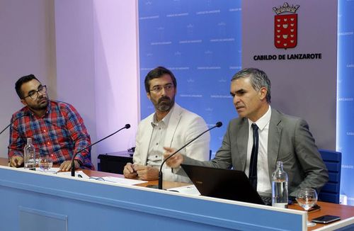 El presidente del Cabildo de Lanzarote, Pedro San Ginés, el consejero de Turismo, Echedey Eugenio, y el consejero delegado de la Sociedad de Promoción Exterior de Lanzarote, Héctor Fernández, presentaron este martes a la opinión pública las conclusiones del trabajo realizado por la delegación que representó a la isla en la recién celebrada Feria Internacional de Turismo de Madrid, Fitur'16.