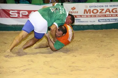 Además, en la noche del pasado jueves se enfrentaban el Tinajo Sondeos y Perforaciones la Cañada y el Unión Sur Yaiza Graficame, luchada que finalizaba empatada a 12. Con buena entrada de aficionados y arbitraje de Francisco Hernández, comenzaba una luchada que tuvo la clave en la eliminación mutua en la última agarrada, entre Aitor Lorenzo y Andrés Guillén. Ambos, tras irse lucha a lucha y una separada, quedaban eliminados situando el empate a doce en el marcador. El puntal visitante venía de dar en tierra con Moisés Brito, Moisés Olivero y Jonathan Morales.