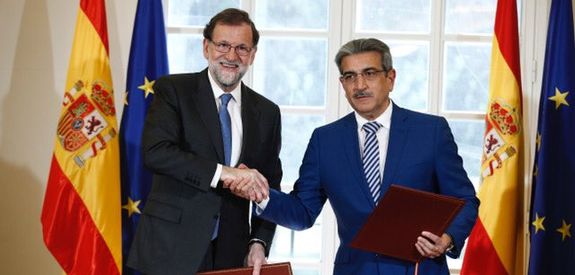 El presidente del Gobierno y del PP, Mariano Rajoy, y el de Nueva Canarias, Román Rodríguez, han firmado este martes el acuerdo por el que los nacionalistas canarios apoyarán los Presupuestos del Estado para 2017, apoyo que asegura al Ejecutivo la aprobación de las cuentas en el Congreso. En el acto ha estado presente el líder del PP de Canarias, Asier Antona.
