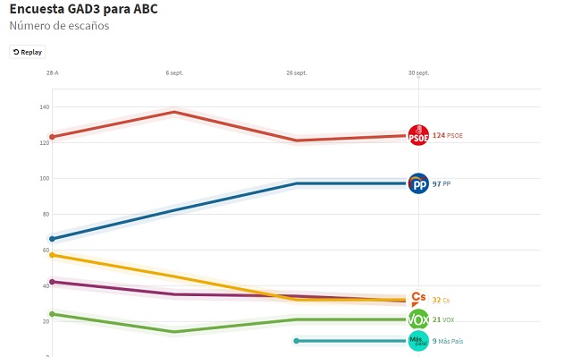 En los útimos cuatro días, la intención de voto de los ciudadanos españoles de cara a las elecciones generales del 10-N sólo ha registrado dos leves variaciones. El PSOE recupera tres de los escaños perdidos en el último sondeo de GAD3 para ABC, alcanzando los 124 escaños, lo que supone superar en uno el resultado del 28-A. El perjudicado es Unidas Podemos, que baja esa misma cifra hasta los 31, lejos de los 42 del 28-A, lo que permite a Ciudadanos volver al tercer lugar.