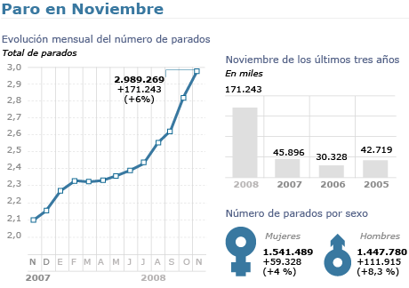 El desempleo registrado en los Servicios Públicos de Empleo -antiguo INEM- subió por octavo mes consecutivo y en noviembre se incrementó en 171.243 personas, lo que sitúa el número total de desempleados en 2.989.269.