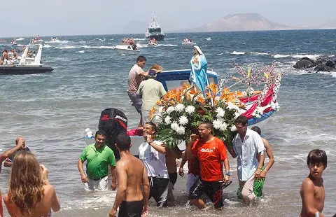 Este domingo al mediodía unas 5.000 personas se acercaron a Caleta de Famara a despedir a la patrona, Nuestro Sagrado Corazón de María. La imagen recorrió las calles de la localidad y también fue embarcada para que la virgen pudiera bendecir la actividad marinera.