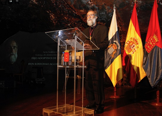 A continuación fue el turno de las intervenciones protocolarias, siendo el primero en subirse al escenario de Jameos Enrique Pérez Parilla, ex-presidente del Cabildo y amigo personal de Ildefonso Aguilar. Pérez Parrilla loó en su discurso “la indiscutible calidad artística de Idelfonso, cuya trayectoria ha sido seguida y reconocida por críticos y especialistas dentro y fuera de nuestro país”, y el indudable “respeto y amor por Lanzarote y su paisaje” que siente el artista, y que ha sido “motivo de inspiración personal y objeto de su actividad artística”. Parrilla afirmó que “este reconocimiento hace justicia a una vida dedicada al arte y a Lanzarote”.