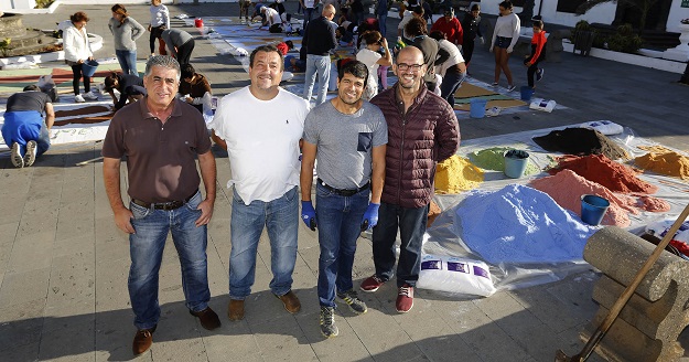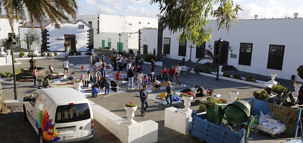 Los colectivos culturales y sociales de Teguise se reunieron un año más alrededor de la Plaza de La Constitución para conmemorar la festividad el Corpus Christi y la tradición de elaborar alfombras de sal, que fueron cogiendo forma y color a lo largo de la tarde de este viernes en la Real Villa de Teguise.