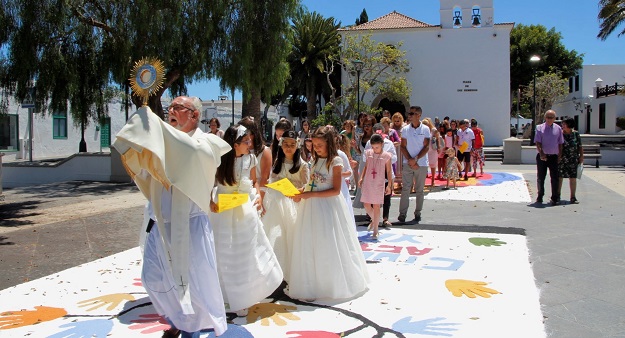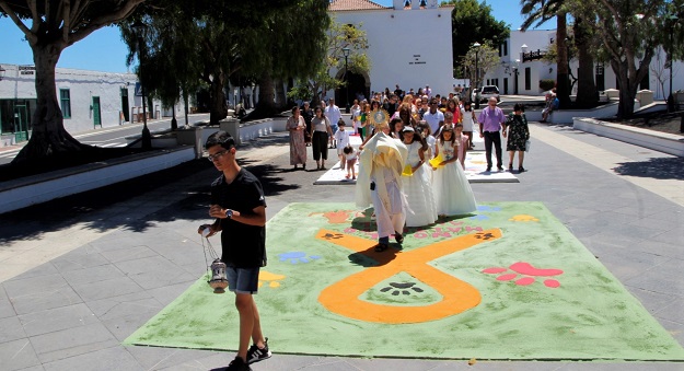 Creyentes y acompañantes celebraron este domingo en Yaiza la solemne función del Corpus Christi participando de la eucaristía en la iglesia de Los Remedios y luego de la procesión en la plaza de la localidad pisando media docena de alfombras de sal elaboradas por vecinos y colectivos convocados por el Área de Participación Ciudadana del Ayuntamiento sureño.