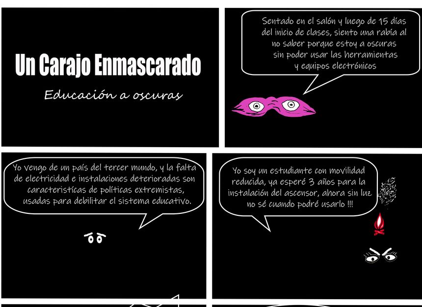 El alumno que firma la viñeta se llama Jose Cabrera y es estudiante de segundo año del Ciclo Superior de Cómic en el turno de la tarde. "Los cortes no nos permiten ver en clase a partir de las ocho de la tarde y tampoco podemos encender ningún equipo informático, por lo cual no podemos avanzar en nuestra formación académica", se queja con toda la razón del mundo.