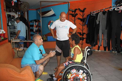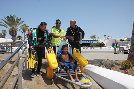 Cuando llegó la hora de entrar en el agua, los voluntarios de Emerlan ayudaron con la silla anfibia que el Ayuntamiento de Tías pone a disposición de todos los usuarios que la necesiten de forma gratuita. Junto a Anthony estuvieron en todo momento su madre, Zoila Casanueva, actual presidenta de la Asociación Triwww para el deporte adaptado y el concejal de Turismo del Ayuntamiento de Tías, Amado Vizcaíno, que ayudó en la primera experiencia subacuática del pequeño.