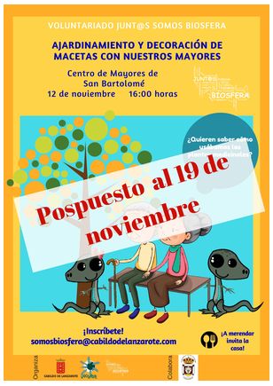 La actividad de voluntariado que Junt@s Somos Biosfera, dependiente de la Oficina de la Reserva de la Biosfera del Cabildo de Lanzarote, tenía previsto desarrollar el 12 de noviembre en San Bartolomé bajo el epígrafe 'Ajardinamiento y decoración de macetas con nuestros mayores', se ha aplazado al domingo 19 de noviembre.