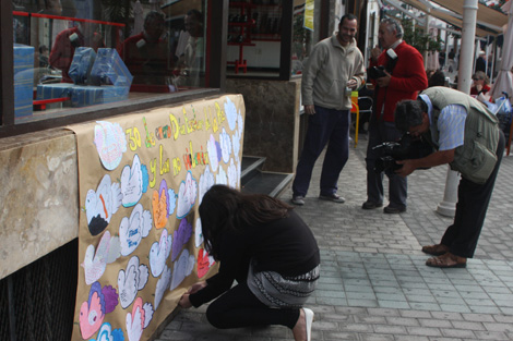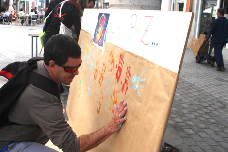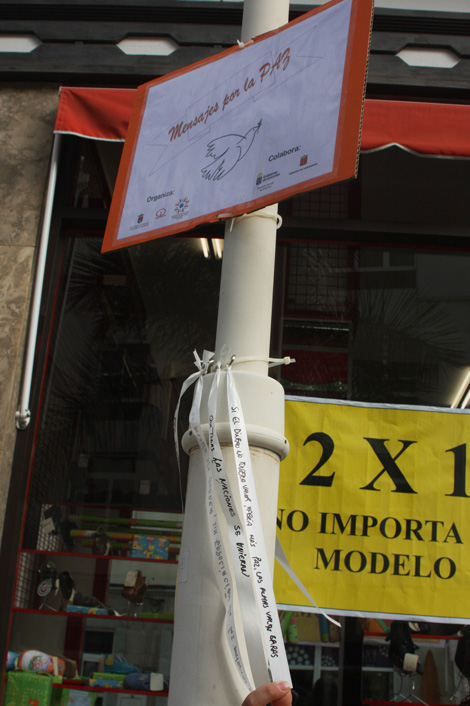 Así, se dispuso un panel con información sobre los conflictos armados vigentes en el mundo y se colgaron cintas de las farolas en las que toda persona que quisiera, podía dejar escrito un mensaje relacionado con la paz.