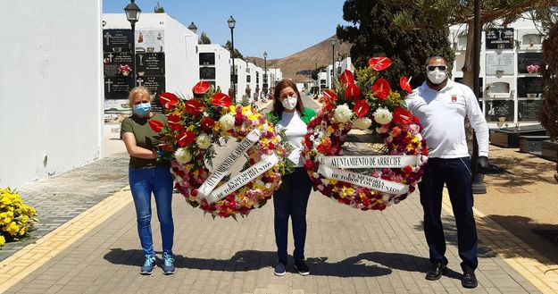 La alcaldesa de Arrecife, Astrid Pérez, y la concejal de Sanidad- área a la que está adscrita el Cementerio de Arrecife, Saro González Perdomo , se han trasladado al cementerio de San Román para depositar múltiples centros de flores y cuatro grandes coronas en recuerdo a las personas fallecidas por el covid 19, y todas aquellas familias que en estas semanas han perdido a familiares y no han podido velarlo ni acompañarlo en su entierro.