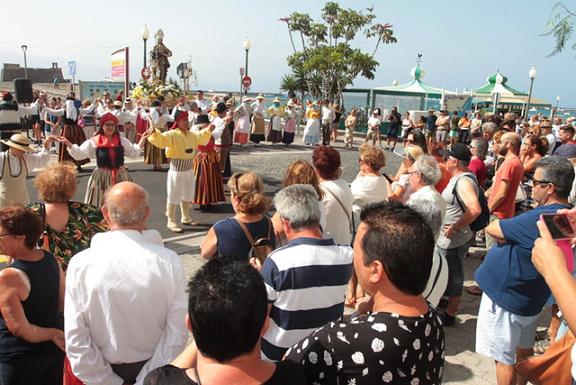 Es la segunda edición de este encuentro entre los grupos y los vecinos y vecinas ante el patrón de las fiestas San Ginés y ha vuelto a ser un éxito de asistencia. Las cuatro agrupaciones, Guayasanta de Tenerife, Guayadeque de Gran Canaria, Tetir de Fuerteventura y Coros y Danzas de Arrecife partieron desde las Cuatro Esquinas cantando y bailando recorriendo la calle Real hasta llegar a la ’Boca del Muelle’ donde realizaron la ofrenda a San Ginés.