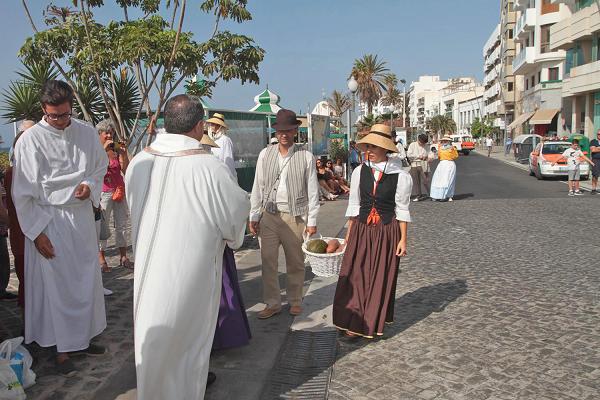 Durante todo el recorrido los grupos culturales fueron interpretando canciones del folclore además de mostrar sus danzas. El patrón San Ginés custodiado por el párroco Miguel Hernández, esperaba la ofrenda musical en forma de folías, isas, malagueñas y seguidillas.