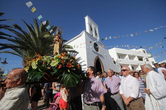 La procesión a la Virgen partió desde la iglesia de Puerto del Carmen hasta el Varadero desde donde se embarcó en Layuno Zallo, el mayor barco en la Cofradía de Pescadores y que este año se estrena en la procesión que coincide con el 50 aniversario de Puerto del Carmen. Momentos antes de trasladar a la imagen de la virgen desde el pesquero hasta su iglesia, el párroco de Tías invitó a la Familia Rodríguez( armadora del atunero) y los integrantes de su tripulación acercarse a la imagen de la Virgen y tocarla para que recibieran en sus nuevas y muchas singladuras, la protección de la patronal del Mar.