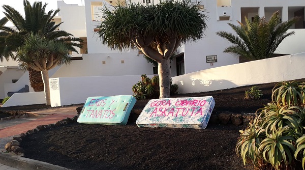 ¿Artistas, grafiteros, simples gamberros, turistas, residentes? Teniendo en cuenta que la Policía Local y la Guardia Civil se habrán enterado seguramente después de que nuestro fotógrafo inmortalizara la obra, es difícil que lo lleguemos a saber. De hecho, el Ayuntamiento de Teguise actuó presto y a la hora en la que circulaban por la zona los menos madrugadores ya no quedaba ni rastro de los colchones, y mucho menos de Eros y Tánatos.