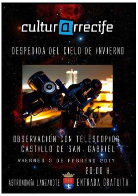 El edil, aprovecha la ocasión para invitar a la ciudadanía a despedirse del cielo de invierto el próximo 3 de febrero. La observación gratuita tendrá lugar el próximo 3 de febrero en el Castillo de San Gabriel, en Arrecife a las 20:00 horas.