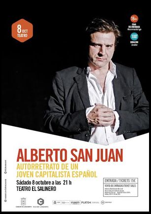 Esta es solo una de las numerosas críticas positivas positivas que se ha llevado Autorretrato de un joven capitalista español, la nueva obra de teatro del actor Alberto San Juan que podremos ver este sábado 8 de octubre, a las 21.00 horas en el Teatro El Salinero. Así lo anuncia el Cabildo insular de Lanzarote en nota de prensa enviada a este diario.