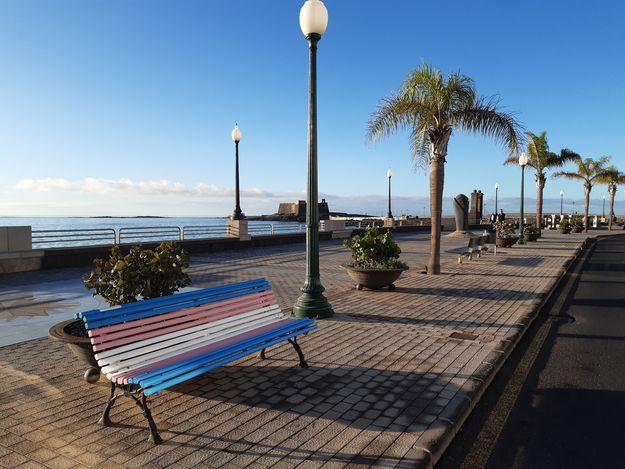 Desde la Concejalía de Servicios Sociales, Igualdad e Inmigración, bajo la dirección de la concejal portavoz del PP en el Consistorio capitalino, María Jesús Tovar, se ha instalado un banco customizado con los colores del colectivo trans en la avenida marítima junto al edificio central del Ayuntamiento.