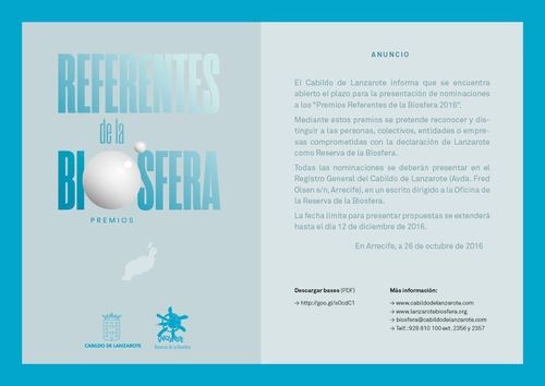 El plazo para presentar las nuevas candidaturas a esta tercera edición de los 'Premios Referentes de la Biosfera de 2016' , precisa este viernes el Cabildo en nota de prensa, permanecerá abierto hasta el próximo 12 de diciembre.