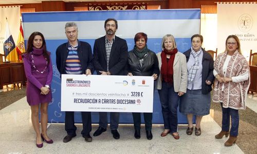 Además de este acto de agradecimiento, el colectivo Rotary Club hizo entrega a Cáritas Diocesana de la Parroquia de San Ginés de un cheque de 3.228 euros de lo recaudado en los stands por la venta de agua y refrescos en el Festival Enogastronómico de Teguise.