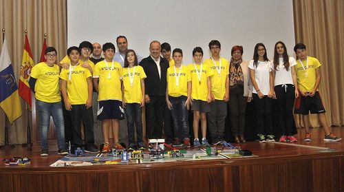 El presidente del Cabildo de Lanzarote, Pedro San Ginés, y la consejera de Educación, Carmen Rosa Márquez, felicitan a los alumnos del IES Salinas de Arrecife de primero de la ESO ganadores del premio a la “Inspiración” en el concurso internacional de robótica 'First Lego League'.