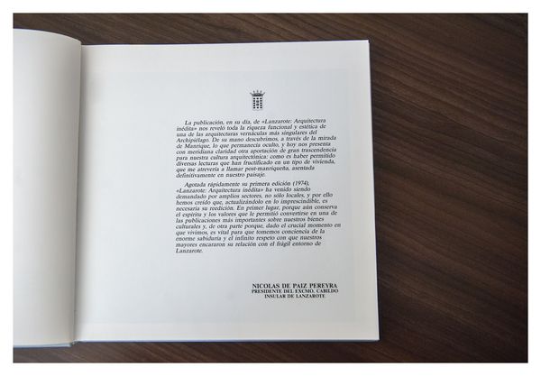 El acto de presentación de la tercera edición del libro ha estado a cargo del jefe de Publicaciones del Cabildo de Lanzarote y director y escritor, Félix Hormiga, y del secretario del Patronato de la Fundación Fernando Higueras, Alberto Humanes, quienes destacaron el “incalculable valor de esta obra” para conocer la esencia de la arquitectura y las construcciones tradicionales y populares de Lanzarote. Este libro, apuntó Hormiga, supone “una especie de carné de identidad espiritual” de la arquitectura y las construcciones de la isla y explicó igualmente que “su esencia es lo que hizo a la gente admirar la arquitectura de Lanzarote”.