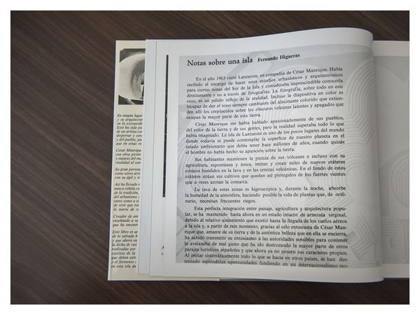- • La Fundación César Manrique (FCM) rechazó una oferta de colaboración con el Cabildo para la producción conjunta del libro, desautorizando su reedición. Esta tercera edición de 2019 del Cabildo de Lanzarote, tras la editada también en 1988 por la primera Corporación, bajo la presidencia entonces de Nicolás de Páiz, ha sido autorizada por la Fundación Fernando Higueras, quien ostenta los derechos de edición sobre la publicación original