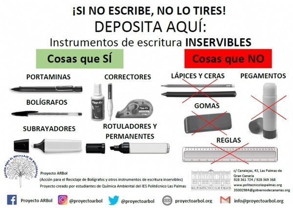 Durante la pasada campaña se recogió en Lanzarote un total de 60 kilogramos de los 1.006 kg de este material de escritura que se recibió en el resto de islas del archipiélago que también se sumaron junto a Lanzarote al proyecto ARBol. Un proyecto impulsado en 2015 por un grupo de estudiantes del CFGS Química Ambiental del IES Politécnico Las Palmas, para colaborar con el programa creado por la Fundación TerraCycle y Bic para la recuperación y reciclaje de estos elementos de escritura que han llegado al final de su vida útil.