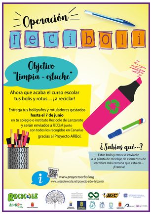 - En la Biblioteca Insular y en los 4 puntos limpios de la isla también se podrá entregar hasta el 14 de junio que serán retirados por el Cabildo de Lanzarote y almacenados en el Complejo Ambiental de Zonzamas para su posterior traslado a Gran Canaria en coordinación con el Proyecto ARBol que recopilará todo el material de Canarias y lo entregará a la Fundación TerraCycle y BIC para su correcto tratamiento y reciclaje