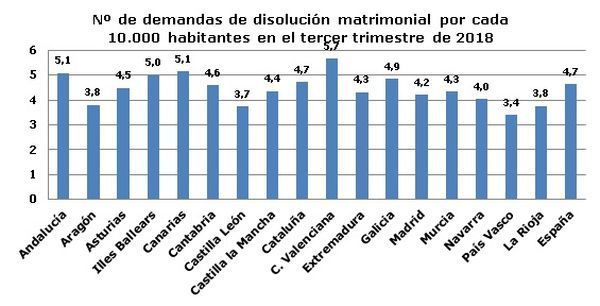 Por el contrario, las proporciones más bajas de disoluciones matrimoniales por habitante se han dado en País Vasco, con 3,4; Castilla y León, con 3,7; y Aragón y La Rioja, con 3,8.