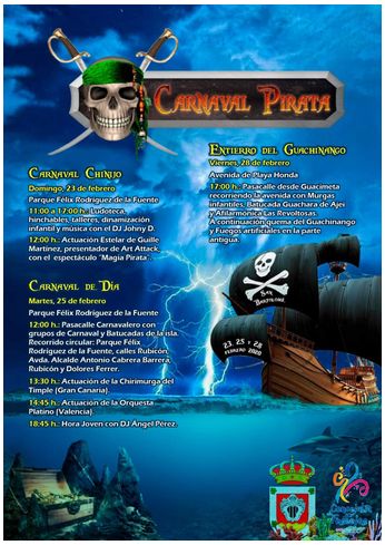 Las celebraciones darán comienzo el domingo 23 de febrero con el Carnaval Chinijo, en horario de 11.00 a 17.00 horas en el Parque Félix Rodríguez de la Fuente. Los más pequeños/as de la casa contarán con ludoteca, hinchables, talleres y dinamización infantil. A las 12.00 horas Guille Martín, presentador de Art Attack hará su actuación estelar presentando el espectáculo “Magia Pirata”.